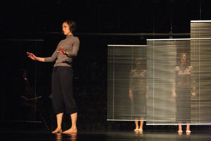 I pokret je, što drugo, nego skroman. Na prvi pogled. Izvođačice, uz pratnju violončelista smještenog iza još jedne rolete u stražnjem kutu pozornice, najprije dugo hodaju samo mijenjajući smjerove. Česte su pauze, pogledi su diskretni i nesigurni. Kada se počinje nazirati konkretno kretanje, ono je sitno, minimalno, suzdržano, djeluje kao da izvođačice skiciraju koreografiju za sebe, u glavi. Takva je i glazba. Međutim, iz toga se razvija novi pokret. Najprije na individualnoj razini, uglavnom je krut, pun trzaja i pauzi, započinjanja i zastajanja, da bi nakon nekog vremena došlo do interakcije, odnosno diskretne sinkronizacije pokreta. Nikada nema međusobnog kontakta. Svaka od njih ima svoje motive koje razvija, a poslije preuzima od druge. Prema kraju jedna od izvođačica razvija cijeli vrtlog pokreta koji nezaustavljivo teče, pun spirala, izbačaja ruku i nogu, skokova, izmjena meke i krute kvalitete, bez kontrole, a tada se sve ponovno smiruje. Ili se samo tako čini?